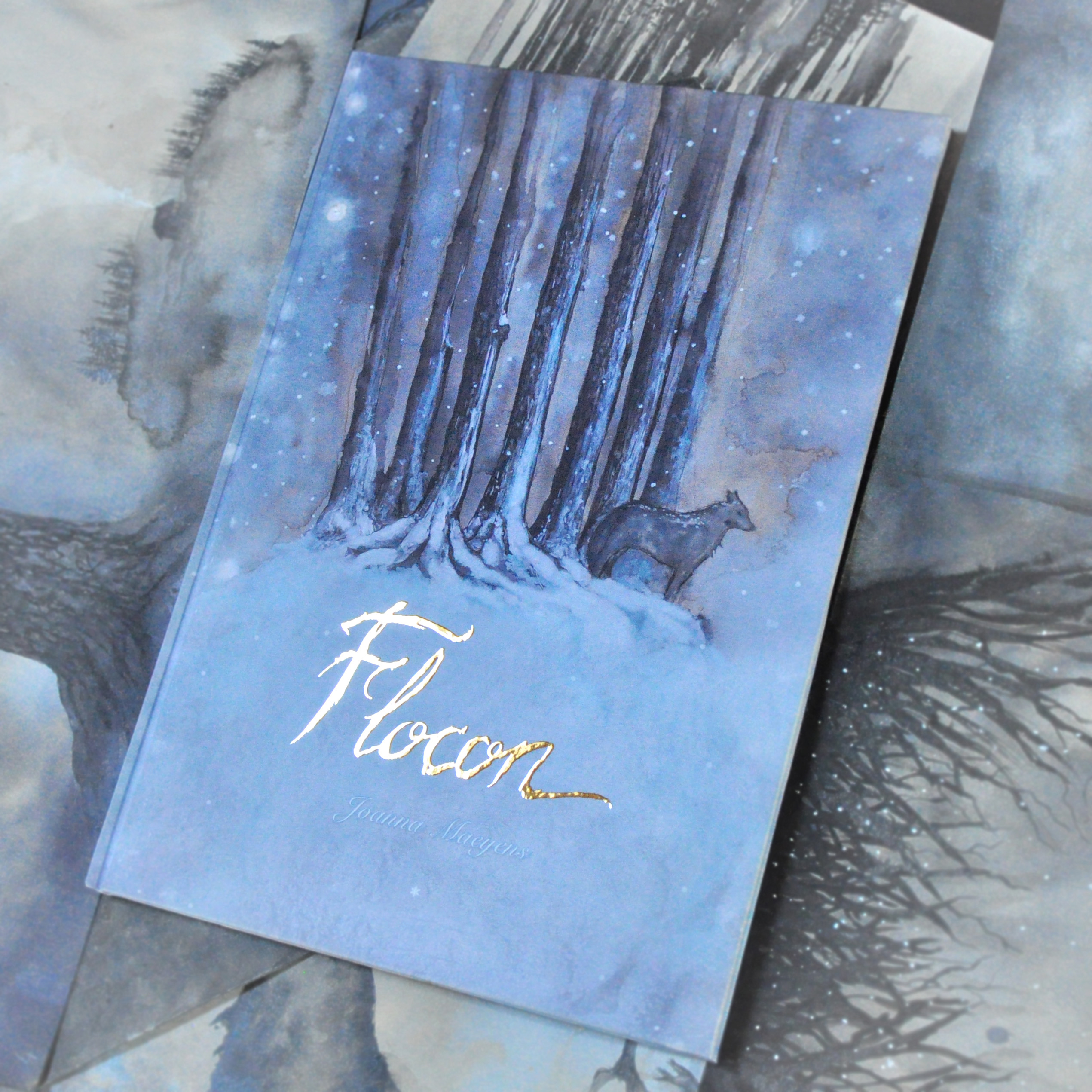 “Flocon est l’histoire d’un loup qui rencontre une enfant dans une vaste forêt. Une amitié rêveuse, pleine de respect naît entre eux.”